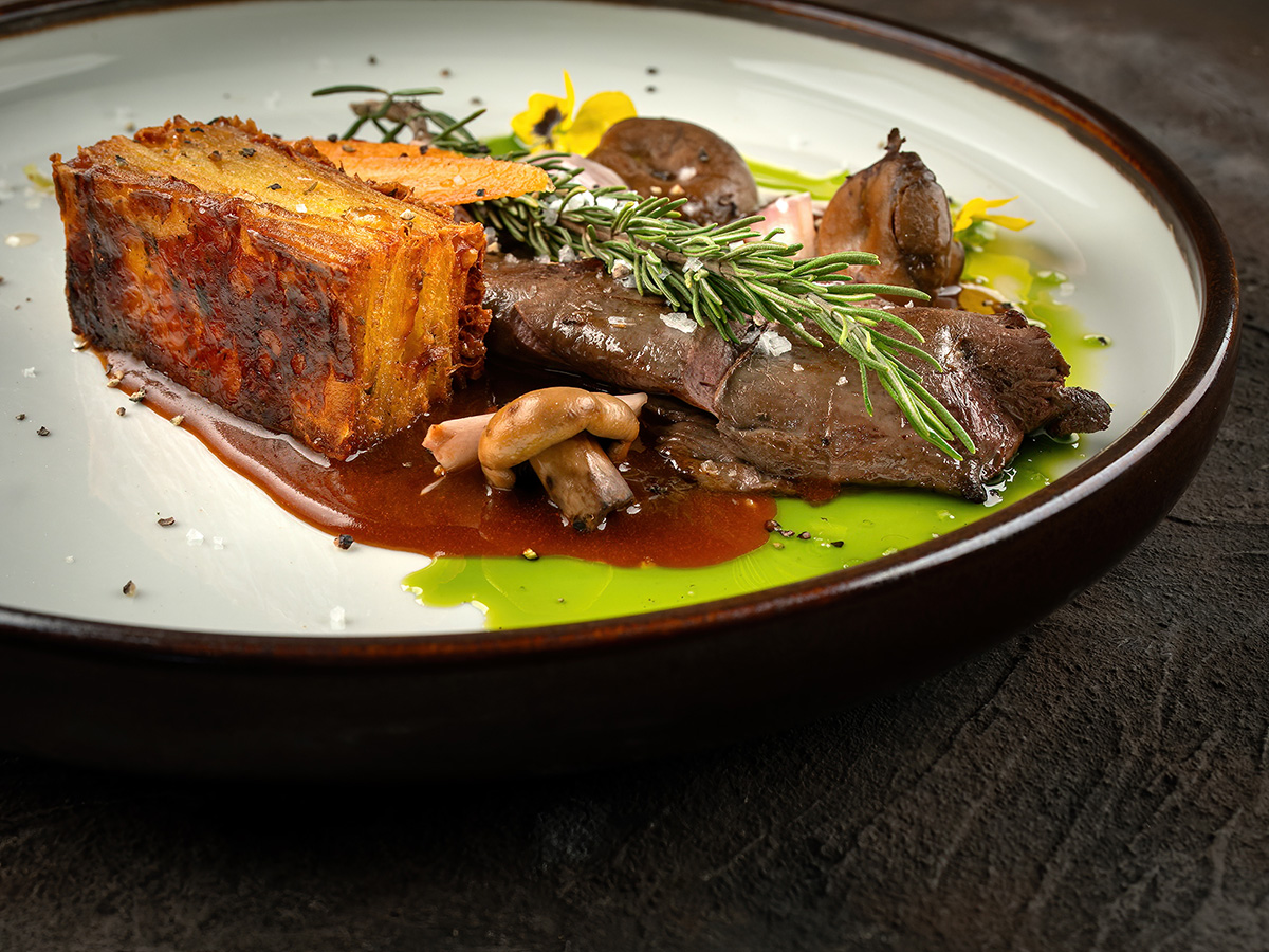Polędwica z sarny sous vide / rydze w maśle szałwiowym / terrina z ziemniaka i topinamburu z truflą / sos demi glace z czerwonego wina i jałowca