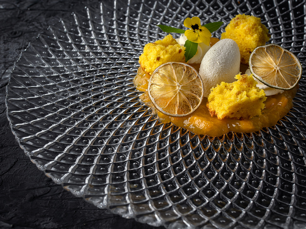 Ciasto migdałowo-pomarańczowe nasączone ponczem z alkoholu z wyciągiem z ziół i pomarańczy / krem werbenowy / konfitowane brzoskwinie / mus z calamansi / skarmelizowana chmurka bezowa / plasterki cytrusów