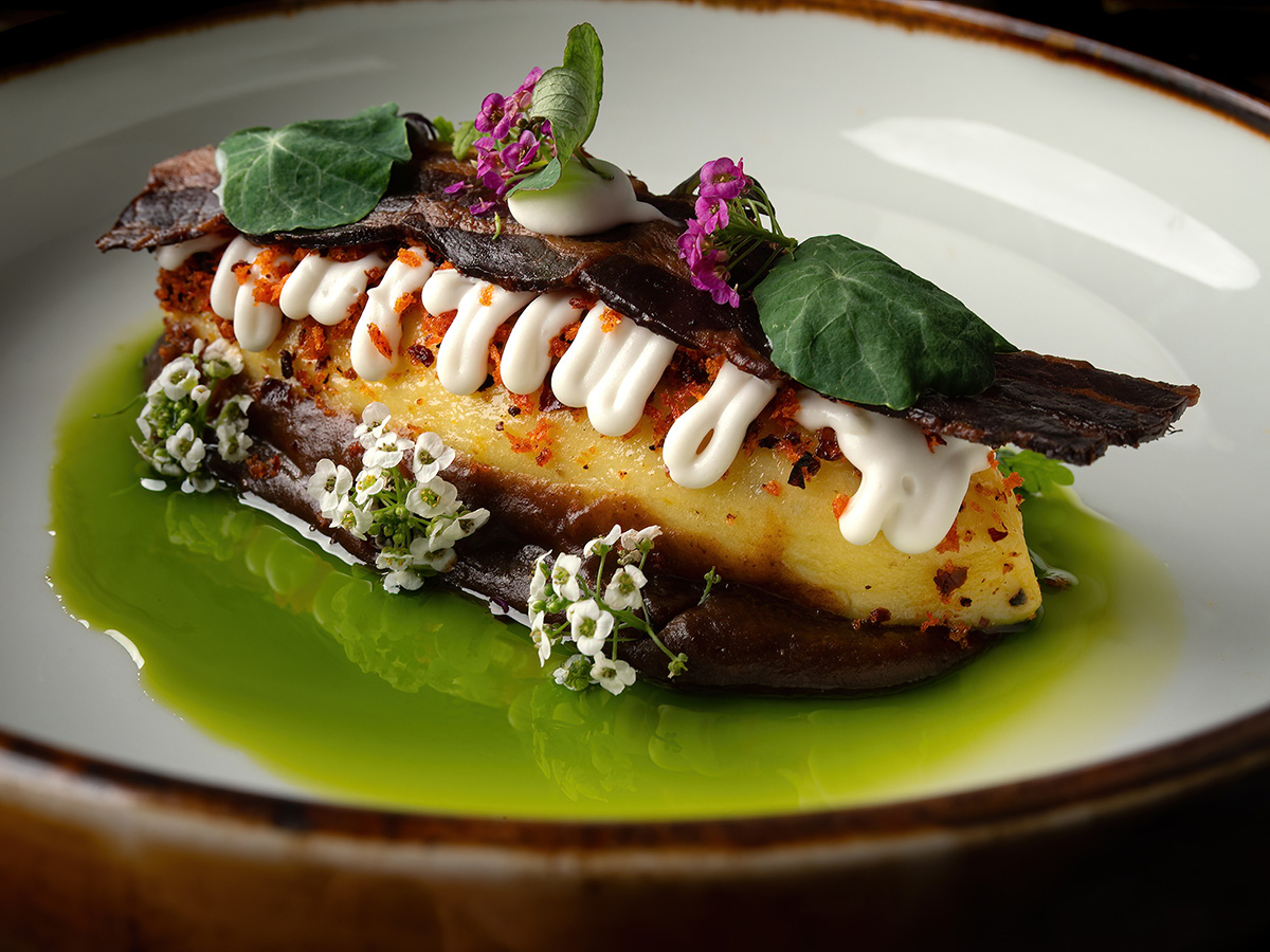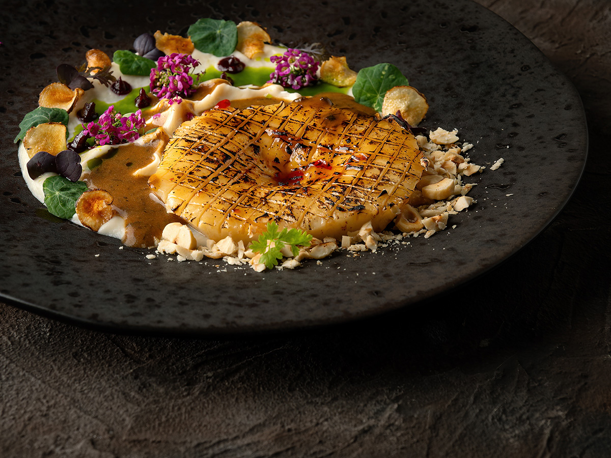 Glazurowany seler / sos demi glace z fermentowanych grzybów / chrupiąca soczewica / mus jabłkowo-pietruszkowy / consomme z borowików / krem z orzechów laskowych / espuma z jarzębiny
