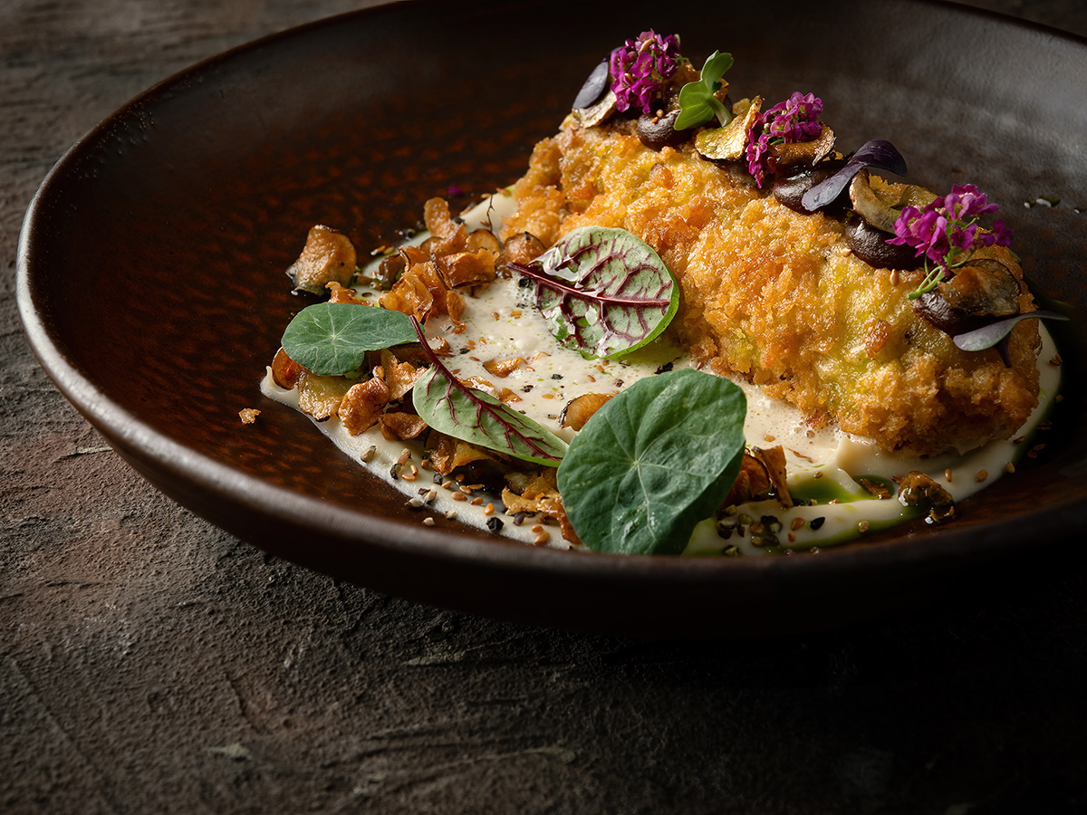 Blin dyniowo-ziemniaczany w panko / rydze / mus z jabłka i pietruszki / pianka z palonego masła / chutney z wędzonej śliwki / chips z topinamburu